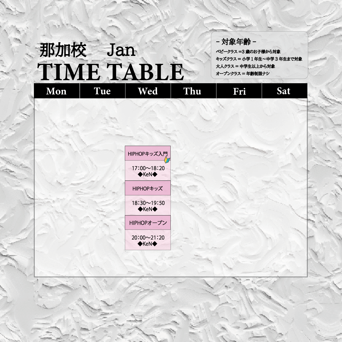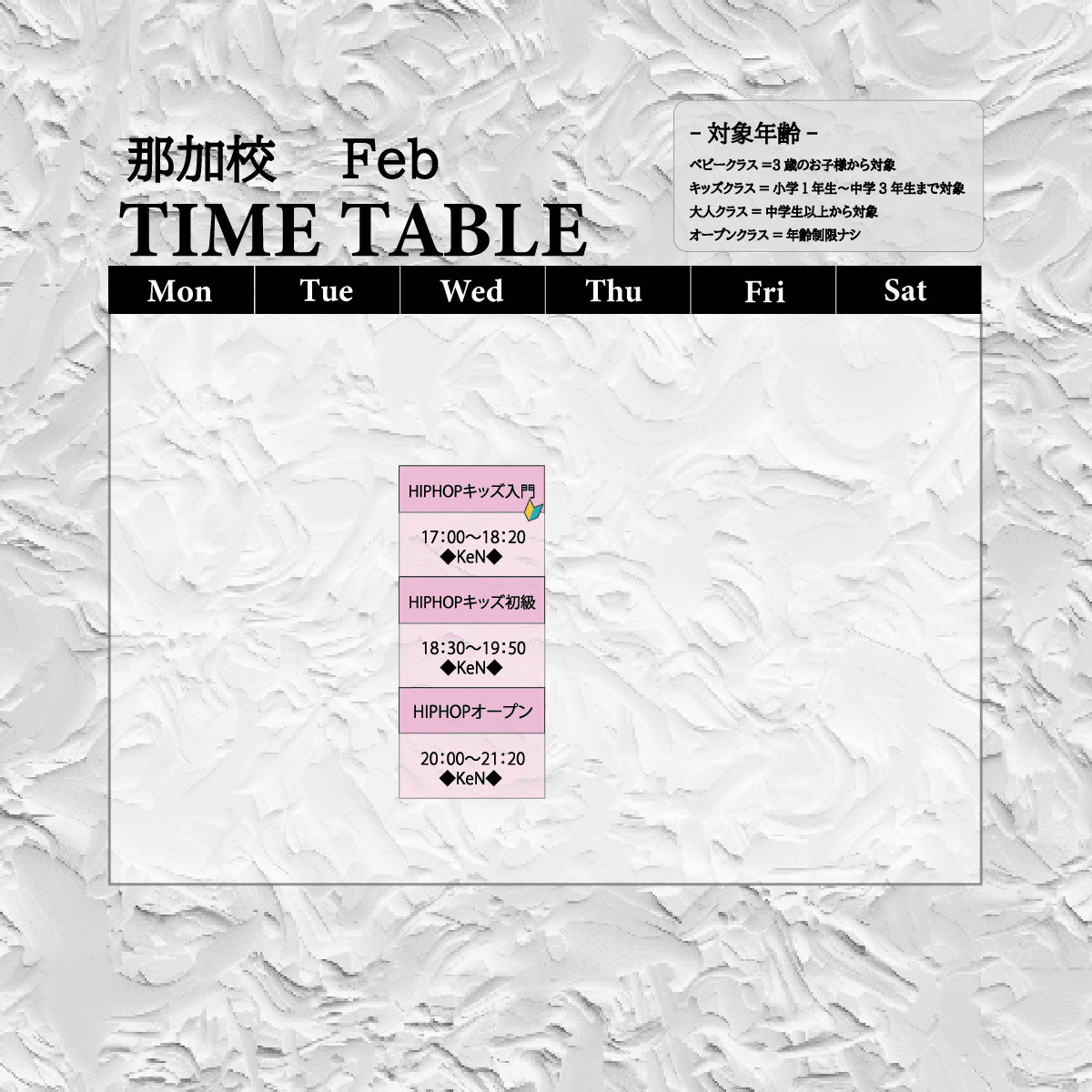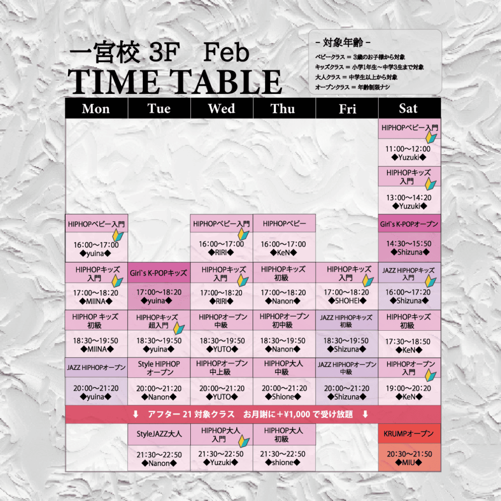 クラスによって異なりますが、年少(3歳)〜大人まで参加可能です。